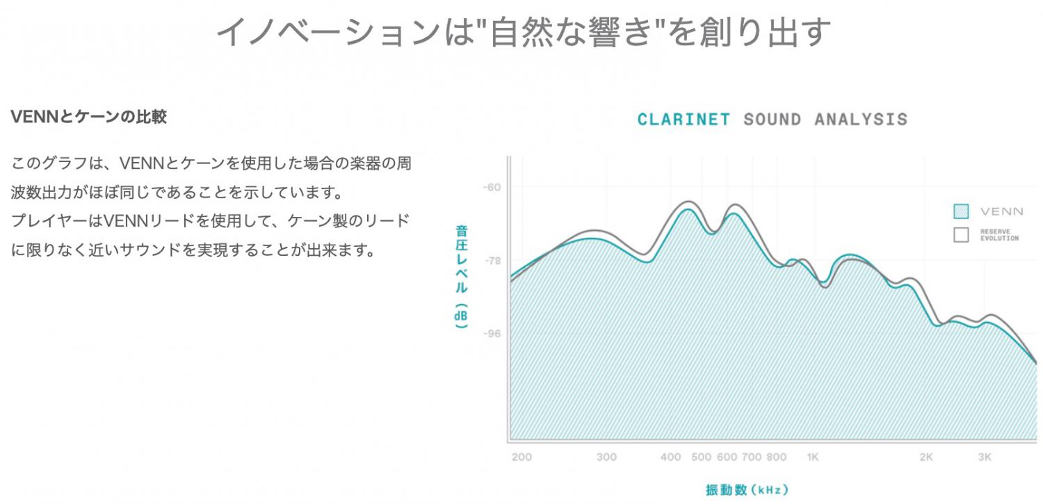そうして、何年もの研究を重ねた結果、物理的にも音響的にも本物のケーンと同じ特性を持ち、人工リードの扱いやすさや寿命の長さを併せ持つVENNの開発に成功したのです。VENNは既存の人工リードに比べて温かなサウンドを持ち、外観は勿論、吹奏感も天然ケーン製のリードに非常に近いものとなっています。
