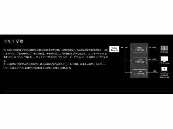 VC-100UHDの内蔵プロセスは同時に最大3系統処理が可能。4K対応のMain、Subの2系統の処理に加え、USB ストリーミング処理専用のプロセスを用意。それぞれ独立した映像処理が行えるため、LEDウォールに4K映像を出力しながらライブ配信し、バックアップをHDのビデオレコーダーで行うといった処理が1台で行えます。