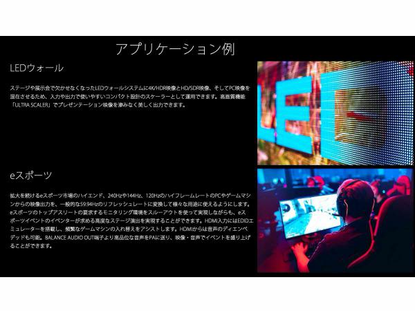 PCから出力するプレゼンテーション映像のシャープさを際立たせることができるので、コンベンションやライブイベントでディテールを強調したい現場で非常に便利です。