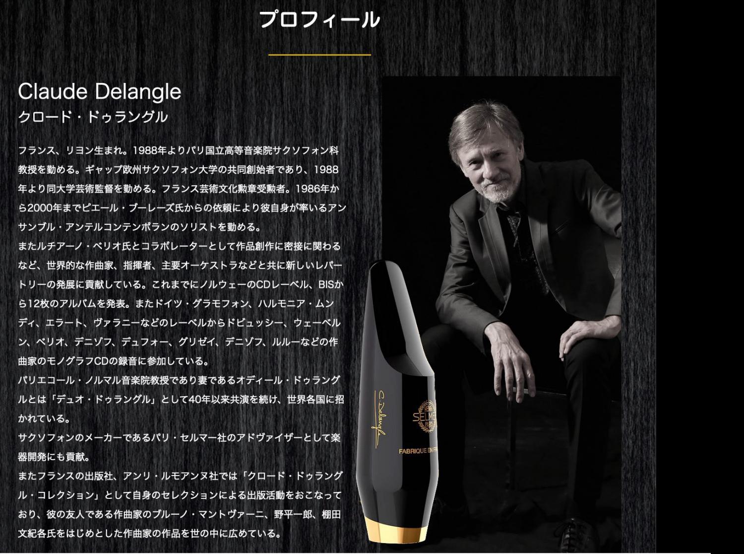 Henri Selmer Paris Claude Delangle alto saxophone mouthpieces セルマー アルトサクソフォン用 マウスピース クロード ドゥラングル ハードラバーセルマー・パリ社の長い伝統を継承しながら、 クロード・ドゥラングル氏との密接なコラボレーションにより誕生。アドルフ・サックスの最初のマウスピースの特徴とされている金属リングとカットデザインは、これまで培ってきた伝統とConceptシリーズの開発で得られたノウハウを基にしており、「エボナイトと金属のハイブリッド」マウスピースとして完成。 金メッキが施された金属リングがボア全体を覆い、音の遠達性が増強され、より緻密で豊かなサウンドが得られます。Claude Delangleモデルはこちらの1モデルのみです。(2021年6月現在)