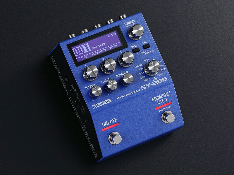 SY-200 Synthesizerは、小さな筐体にアナログ・ライクなシンセ・サウンドを多数搭載。ギターやベースだけでは決して得ることのできないそのサウンドとレイテンシー・フリーの自然な弾き心地により、 奏法をそのままに、新しい表現力をプレイヤーにもたらします。高い評価を得たコンパクト・ペダルSY-1のシンセ・サウンドをベースに、新たな音色を追加。 セットアップしたサウンドは、128個までに本体に保存し、即座に呼び出せます。2つのフットスイッチは、アサイン機能を駆使することで複雑なリアルタイム・コントロールも可能。 外部フットスイッチやエクスプレッション・ペダル、MIDI接続によるコントロール機能も充実しています。
