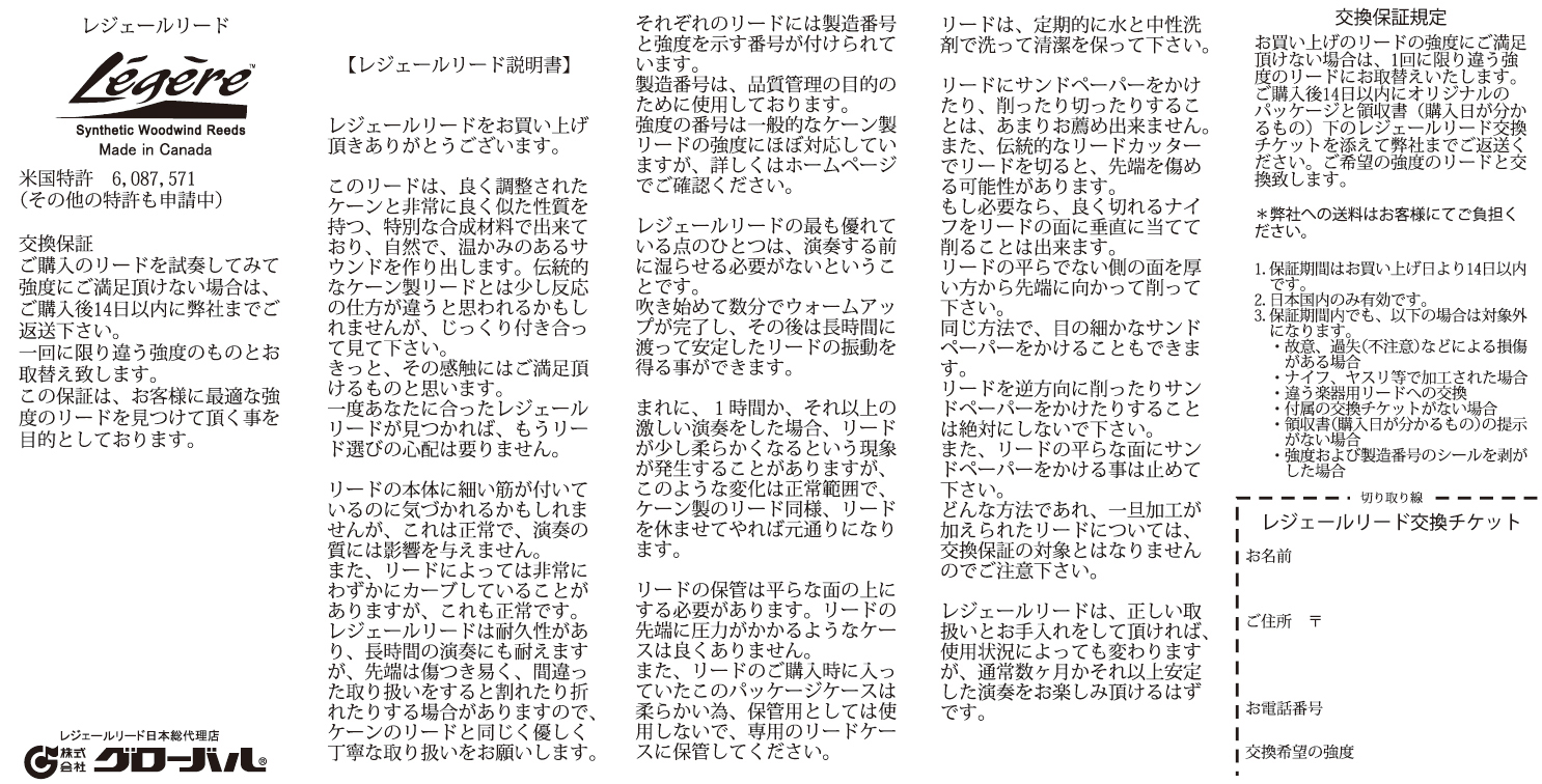 「交換チケット」に内容を記載のうえ「購入証明書」「パッケージに入れたお手持ちのレジェールリード」の3点を同封のうえ「株式会社 グローバル」まで郵送して下さい。