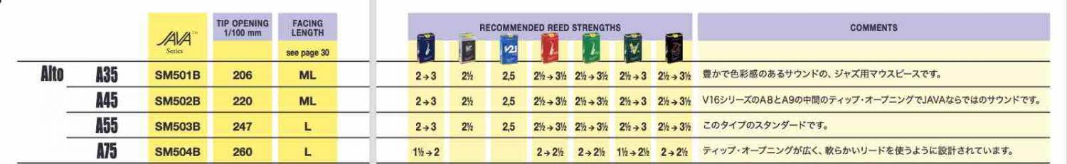 ・JAVA...ジャズ、ソウル、ファンクに理想的なマウスピースです。メタルマウスピースのコンセプトと似ており、かつエボナイトのスタイルの快適さを備えています。JAVAかV16のリードとの使用がおすすめです。