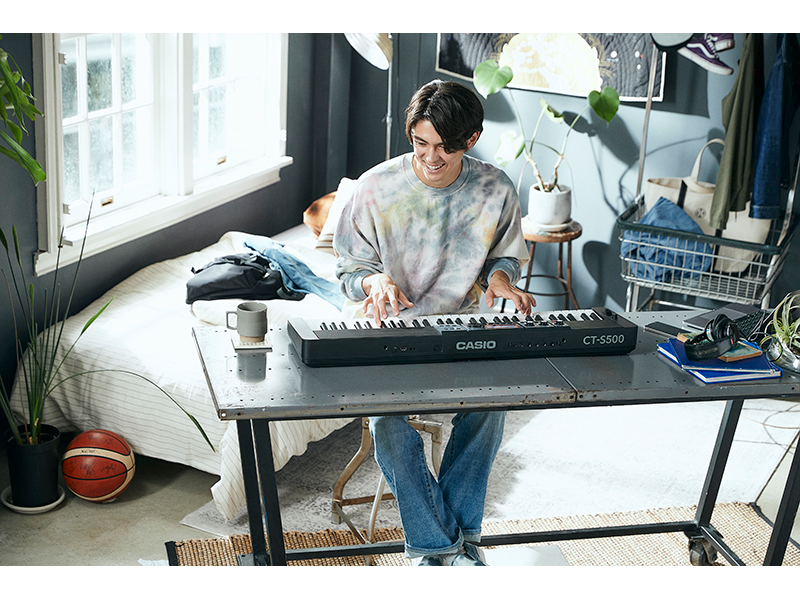 ハイスペックな音と機能。なのに、スタジオやライブ会場への移動に便利な、持ち運びしやすいコンパクトサイズなのもCT-S500の魅力です。もちろん、自分の部屋にCT-S500のためだけの“定位置”を作れなくても大丈夫。ストラップをつければ、スタンドやデスクがない場所でも演奏することができます。