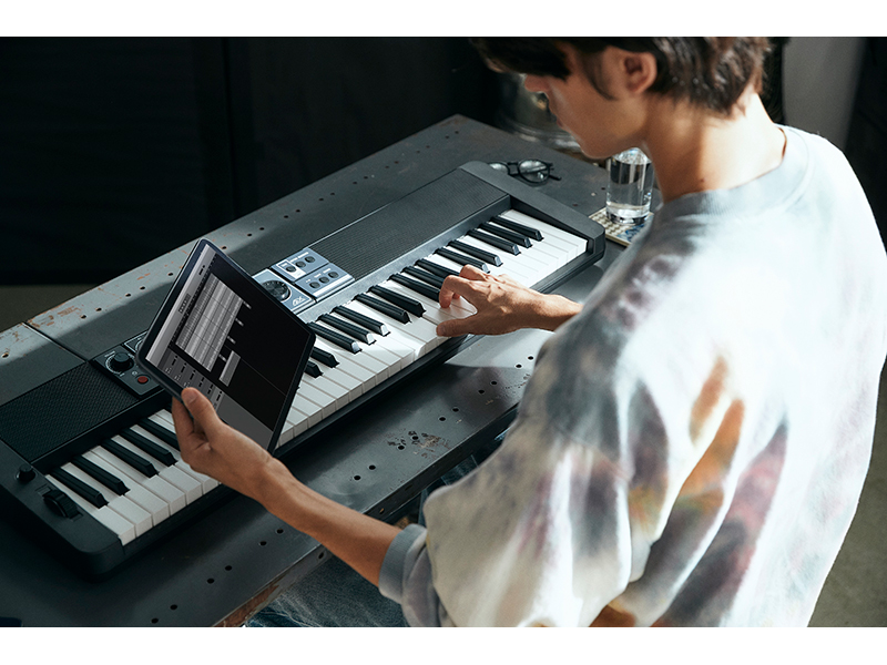 周辺機材や関連機器との接続のための機能が充実しているのもCT-S500の特徴です。例えば、標準ジャックのラインアウト端子を装備しているのでキーボードアンプやミキサーなどの周辺機材との接続もスムーズ。内蔵スピーカーからのサウンドを消すこともできるので、レコーディングやステージでの演奏など、活躍の場が広がります。MIDI対応機器と接続すれば、MIDIデータの入力・編集コントローラーとしてCT-S500 を使うことも可能。また、Bluetoothオーディオ機能でスマートフォンやタブレットとつなげれば、CT-S500 がBluetoothスピーカーとなり、好きな音楽を「聴く」時間にも活躍。さらに、アプリを使えばメロディや伴奏をキャンセルしたりピッチやテンポを変更でき、曲に合わせて演奏を楽しんだり、耳で覚えて弾く練習にも役立ちます。