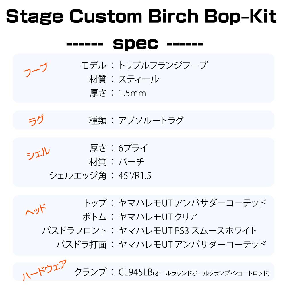 YAMAHA ヤマハ Stage Custom Birch Bop Kit NW DSBP8F3NW シェルセット + ハードウェア (HW780)ヤマハドラムの代名詞とも言えるバーチシェル100%を使用したステージカスタムバーチの小口径バリエーションキットとハードウェアのセット。