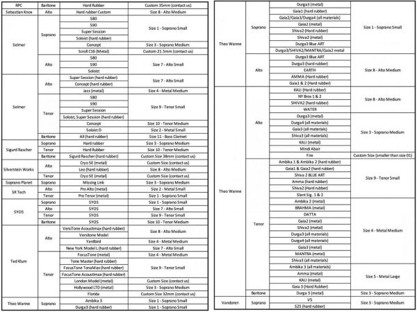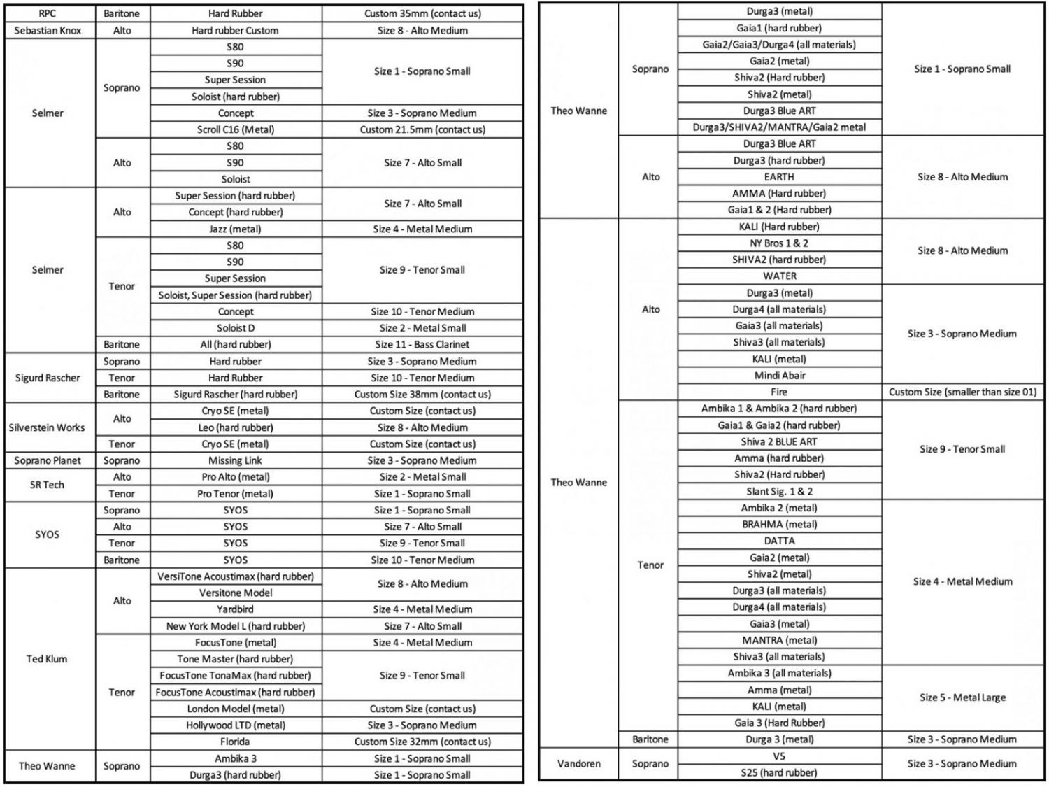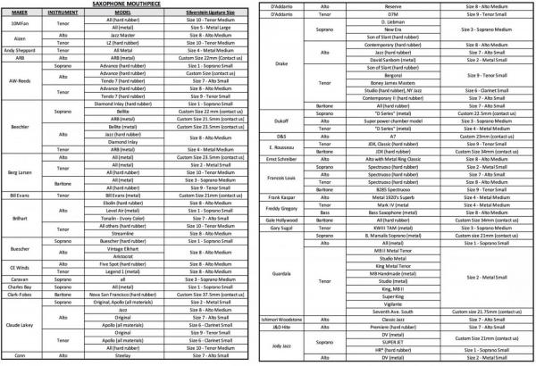 ご自身のマウスピースにどれが合うかどうかにつきましては画像にメーカーが用意している資料がありますのでそちらを参考にしてください。但し、海外サイトでも特定のマウスピースのいわゆるそのブランドの定番シリーズについては表にありますが全てのモデルの対応サイズが記載されてはおりませんし、新しいシリーズについては反映されていなかったり、また出た時期によってのマウスピースのサイズ感の違いも存在するかと思います。海外の資料となりあくまでも参考程度にお考え下さい。また、お客様がご自身でサイズ調整をすることも可能なモデルもあります。※サイズ調整が可能なリガチャーは、2019年以降のモデル(リガチャーコード先端に金属のカバーが付いている仕様のもの)のみとなります。