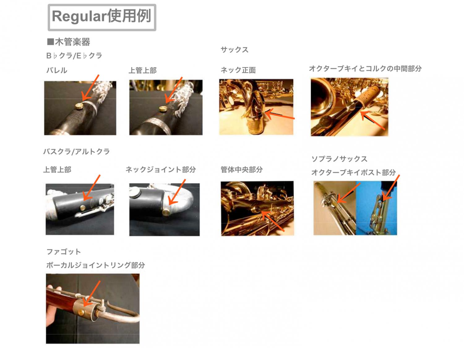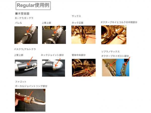 ■木管楽器 ・フルート サイズ:SMALL 装着箇所;頭部管上部、ヘッドクラウン中央 ・B♭クラ、E♭クラ サイズ:REGULAR 装着箇所:バレル、上管上部 ・アルトクラ、バスクラ サイズ:BIG 装着箇所:上管上部、ネックジョイント部分、U字管とベル接合部分 ・サックス 装着箇所:ネック正面、オクターブキイとジョイントコルクの中間部分、管体中央、オクターブキイポスト部分(ソプラノ)、U字管とベルの接合部分(バリトンとテナーはMAXIをおすすめ) ・ファゴット 装着箇所:ボーカル差し込み部分(REGULAR)、バスジョイントとベルのジョイントリング(BIG)