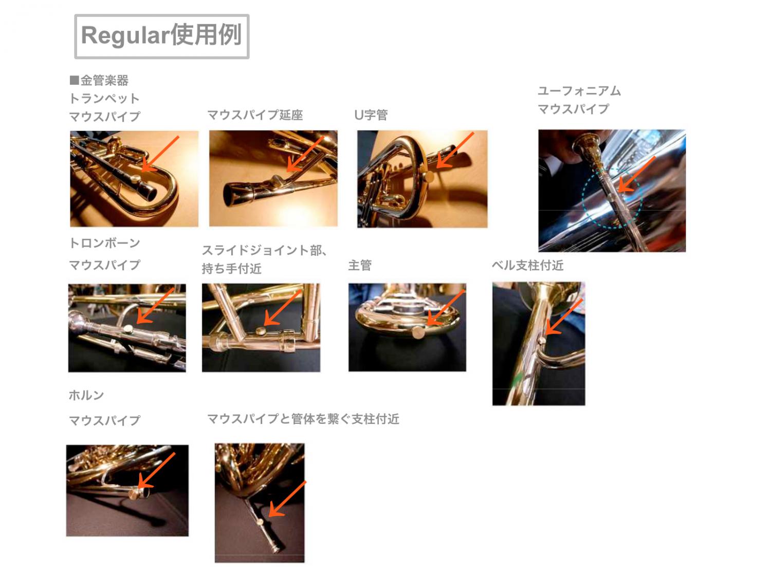 ■金管楽器 ・トランペット サイズ:REGULAR 装着箇所:マウスパイプ、マウスパイプ延べ座、U字管 ・トロンボーン サイズ:REGULAR 装着箇所:マウスパイプ、スライドジョイント部分・持ちて付近、主管部分、ベル支柱付近 ・ホルン 装着箇所:マウスパイプ(REGULAR)、マウスパイプと管体をつなぐ支柱付近(REGULAR)、ベルと管体をつなぐ支柱付近(BIG) ・チューバ、ユーフォ 装着箇所:主管(BIG)、ボトムU字管部分(BIG)、マウスパイプ(REGULAR)
