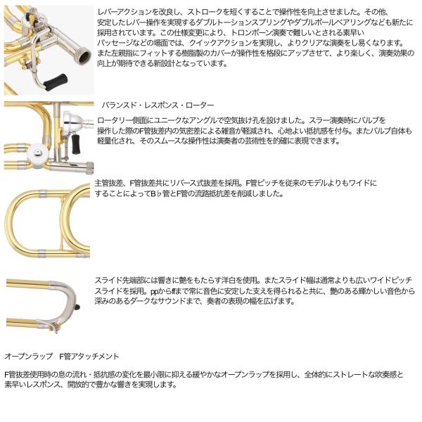 レバーアクションを改良し、ストロークを短くすることで操作性が向上。その他、安定したレバー操作を実現するダブルトーションスプリングやダブルボールベアリングなども新たに採用されています。この仕様変更により、トロンボーン演奏で難しいとされる素早いパッセージなどの場面では、クイックアクションを実現し、よりクリアな演奏をし易くなったようです。また左親指にフィットする樹脂製のカバーが操作性を格段にアップさせて、より楽しく、演奏効果の向上が期待できる新設計となっているようです。