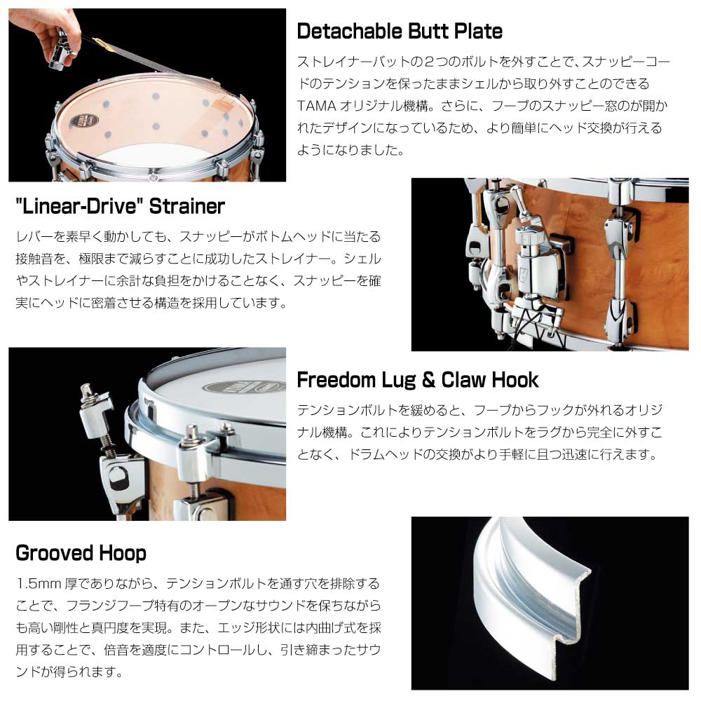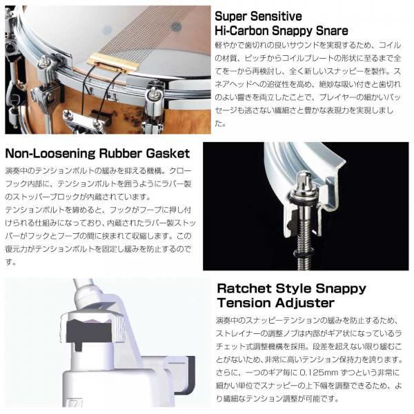 ブラスシェル特有の豊かな倍音と厚みのあるシェルの鳴りに、Grooved Hoopによる抜けの良いアタックをブレンドしたスネアドラム!メタルシェルならではの安定したサウンドを維持しつつ、柔らかく温かな響きを獲得。スナッピーテンションやドラムヘッドの調整次第で、歯切れの良さを強調したメタルシェルらしいサウンドから、甘く心地よいふくよかなサウンドまで幅広い表現力を持ったスネアです。