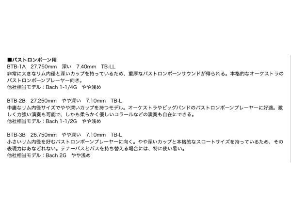 ■特徴:TB-L-6Aのリムサイズを一段階大きくしたモデル。大きくて深いマウスピースで堂々と演奏したいなら、これで決まり。豊かで重量感のある音色は、和音の低音部をしっかり支えることも可能。