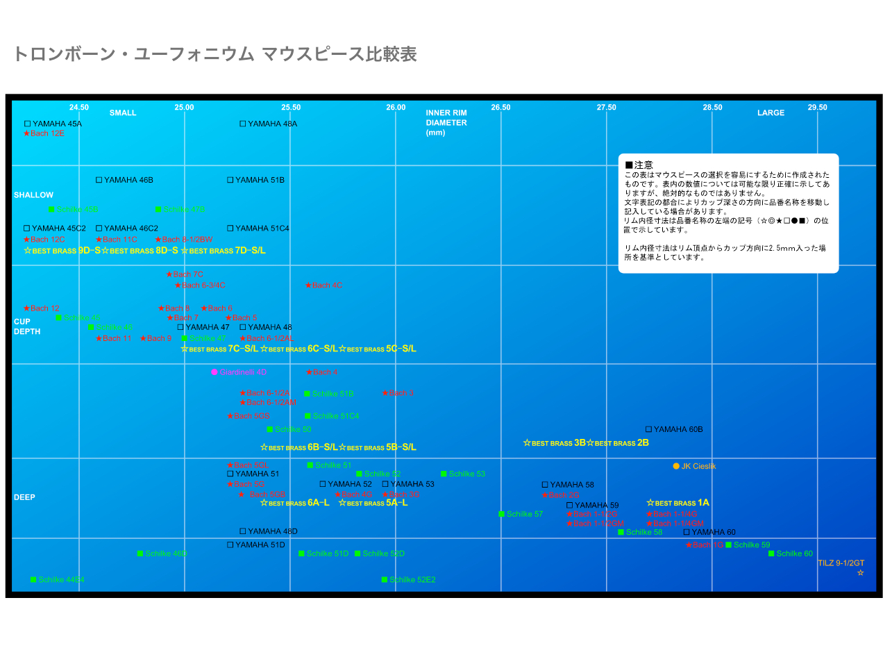 太管トロンボーン用マウスピースの代表格。リム内径・カップ深さなど、全てが中庸なモデルであり、全音域で吹き易いバランスの取れた決定版。幅広い音楽に対応し、プロにも使用者が多い。