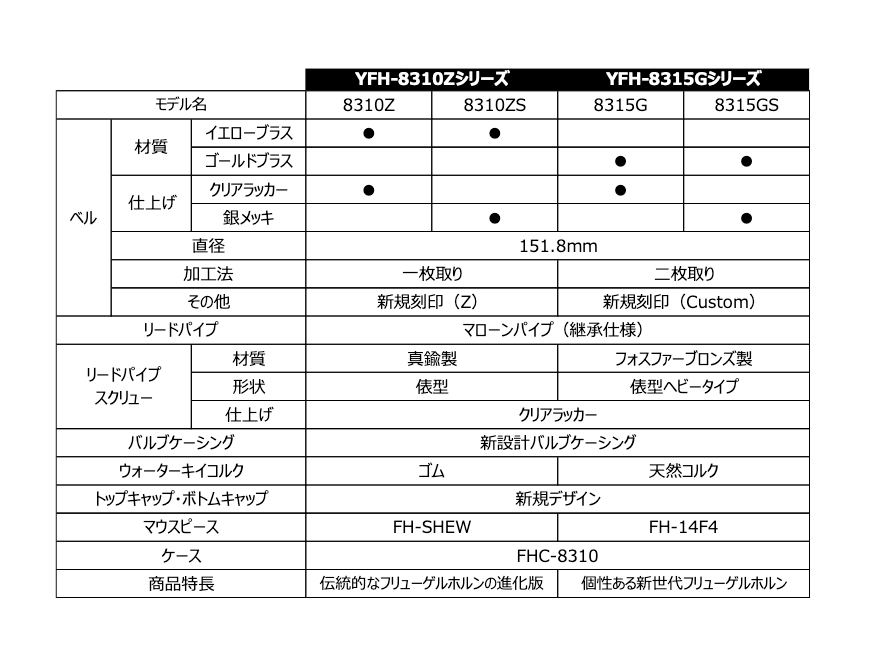 YFH-8315G、YFH-8310Zはどちらも吹奏楽、ジャズシーンでも使用できるモデルです。どちらかというと軽い吹奏感、輝かしい明るめな音色が好みの方はYFH-8310Z、抵抗感がある吹奏感、暖かい深みのある音色が好みの方はYFH-8315Gがあっているかもしれません。