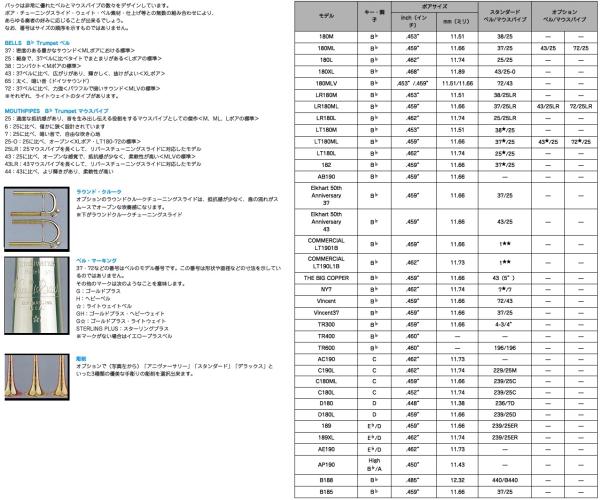 マウスパイプも種類が豊富です。マウスパイプもベルサイズと同じくボアサイズ によって使われるものが決まります。品番にはサイズが記載されませんが180ML37GLには25というマウスパイプが標準仕様となっています。