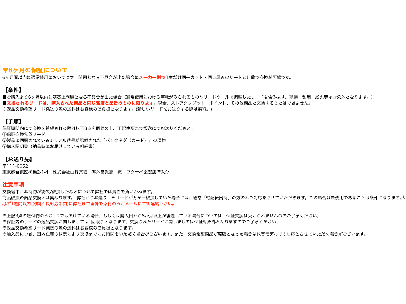▼6ヶ月の保証について 6ヶ月間以内に通常使用において演奏上問題となる不具合が出た場合にメーカー側で1度だけ同一カット・同じ厚みのリードと無償で交換が可能です。