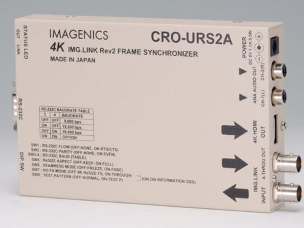 CRO-URS2Aは、4Kフレームシンクロナイザー内蔵型のIMG.LINK(Rev1,2共通)受信器です。弊社製ILSシリーズのスイッチャー切替えにより、極めて高速なフリーズ型またはフェード型のシームレス繋ぎに対応できます。送受信器間のHDMI映像音声信号の絶対遅延は最大50 ms (出力映像の2フレーム -0,+1フレーム)です。音声信号は非圧縮伝送です。また、フレームシンクロナイザー無し動作モードでは、最大2msの低遅延での動作も可能です。