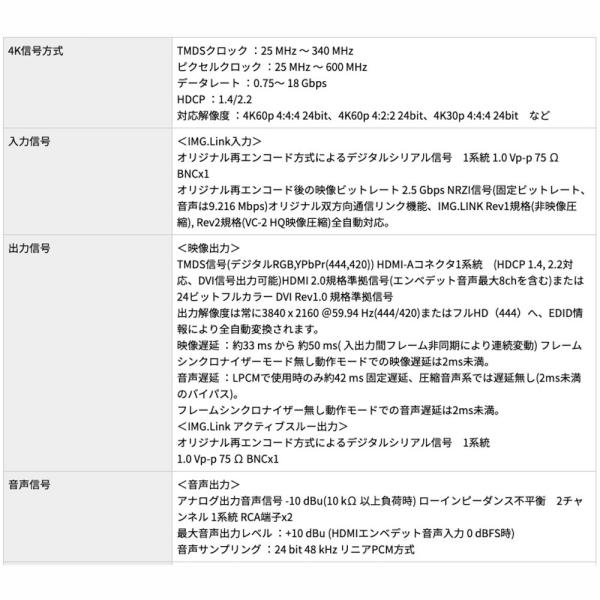 オリジナル再エンコード後の映像ビットレート 2.5 Gbps NRZI信号(固定ビットレート、音声は9.216 Mbps)オリジナル双方向通信リンク機能、IMG.LINK Rev1規格(非映像圧縮), Rev2規格(VC-2 HQ映像圧縮)全自動対応。 |