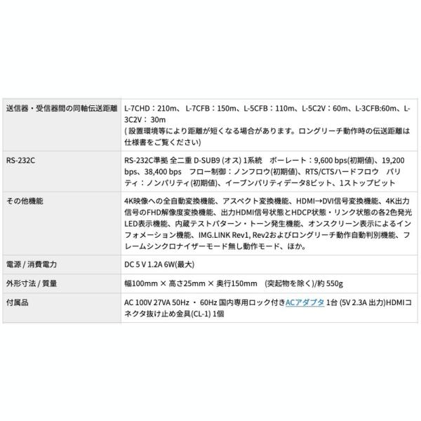 4K映像への全自動変換機能、アスペクト変換機能、HDMI→DVI信号変換機能、4K出力信号のFHD解像度変換機能、出力HDMI信号状態とHDCP状態・リンク状態の各2色発光LED表示機能、内蔵テストパターン・トーン発生機能、オンスクリーン表示によるインフォメーション機能、IMG.LINK Rev1, Rev2およびロングリーチ動作自動判別機能、フレームシンクロナイザーモード無し動作モード、ほか。 |