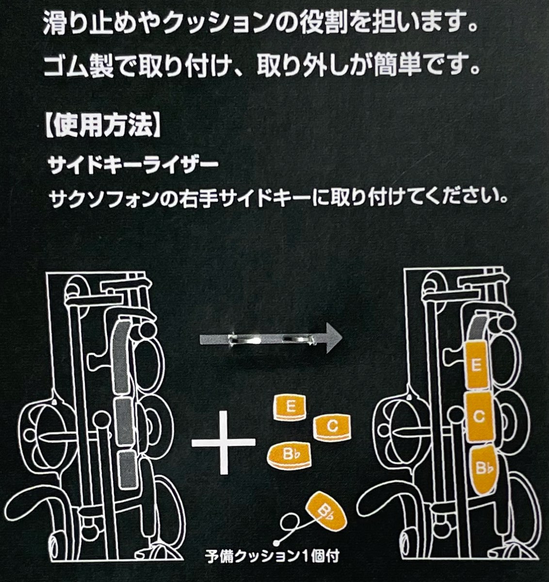 サックスを演奏する際右手で押すサイドキイを操作する際に 手汗でつい滑ってしまう、また手が小さくて押しにくいという方がいらっしゃるのではないでしょうか。 そういった方におすすめの商品です。 ゴム素材なので滑りにくくなります。またライザーに少し厚みがあるため高さが出ることで操作しやすいと感じる方もいるかもしれません。