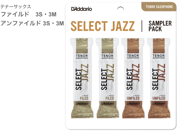・ファイルドカット:レスポンスが容易になります。(特に低音域において)音の立ち上がりに優れ、ソフトなアタックを容易にします。音色が明るめになります。 D'Addario Woodwinds SELECT JAZZ ダダリオ ウッドウィンズ セレクトジャズ■テナーサックス Tenor Saxophone ■サンプラーパック お試し ■ファイルドカット 3S・3M ■アンファイルドカット 3S・3M ■合計4枚入り