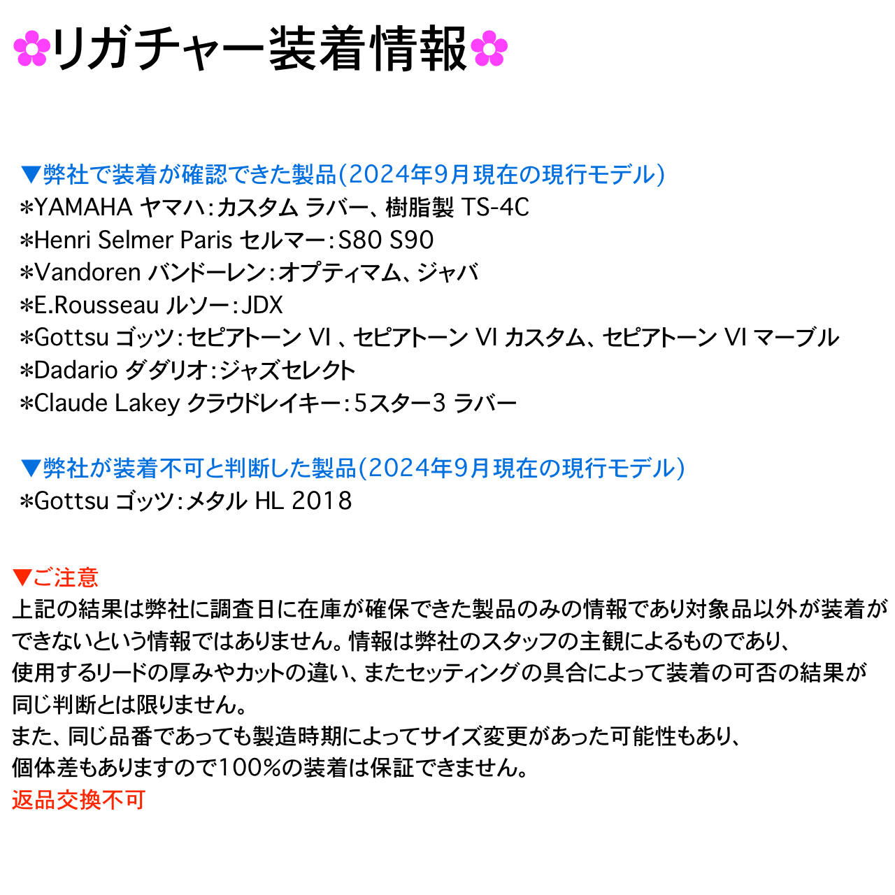 海外製のため若干の汚れ、つくりの粗さなどはご理解下さいませ。リードの厚みやマウスピースの種類によって装着が不可の場合がございます。返品交換不可