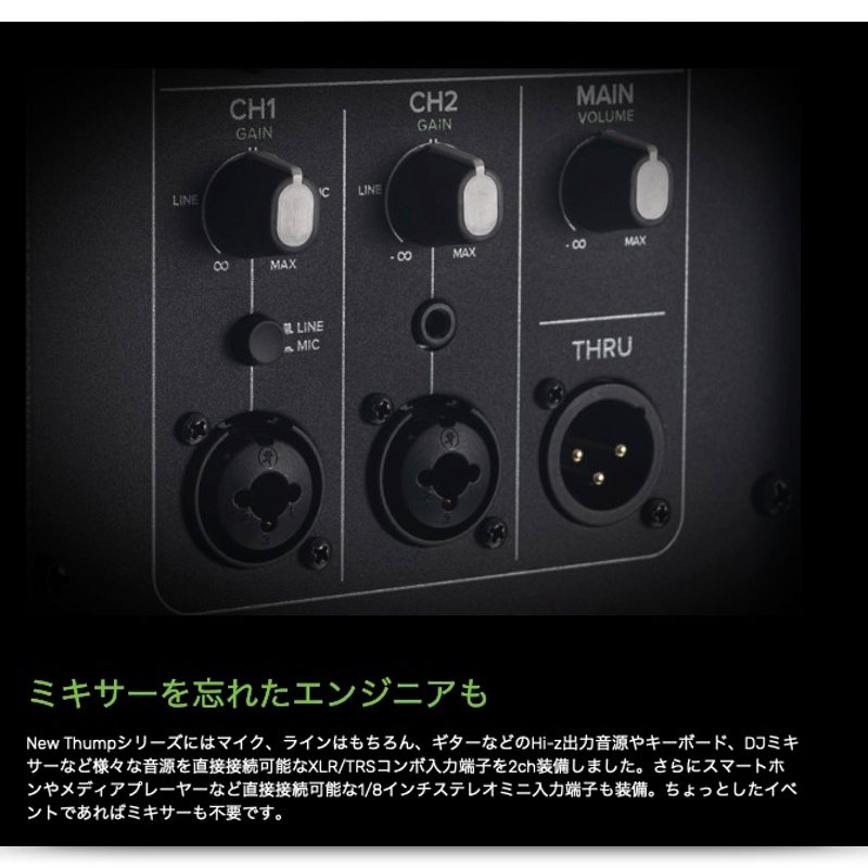 New Thumpシリーズにはマイク、ラインはもちろん、ギターなどのHi-z出力音源やキーボード、DJミキサーなど様々な音源を直接接続可能なXLR/TRSコンボ入力端子を2ch装備しました。さらにスマートホンやメディアプレーヤーなど直接接続可能な1/8インチステレオミニ入力端子も装備。ちょっとしたイベントであればミキサーも不要です。