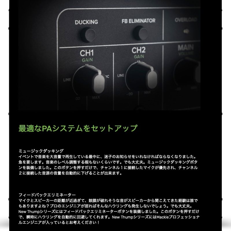 マイクとスピーカーの距離が近過ぎて、鼓膜が破れそうな音がスピーカーから聞こえてきた経験は誰でもありますよね。プロのエンジニアが居ればそんなハウリングも発生しないでしょう。でも大丈夫。New Thumpシリーズにはフィードバックエリミネーターボタンを装備しました。このボタンを押すだけで、瞬時にハウリングを自動的に回避してくれます。New ThumpシリーズにはMackieプロフェッショナルエンジニアが入っているとお考えください!