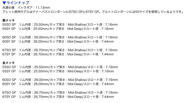▼ラインナップ 共通仕様 バックボア:11.13mm アレッシ使用モデルはテナーバストロンボーンに67SO GPと67SY GP。アルトトロンボーンには55サイズを使用しているようです。
