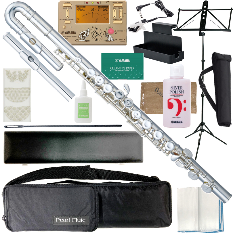 シリーズラインナップ ・プレスト...一番安いシリーズ。すべて洋銀 ・ブリランテ...リッププレート&ライザーが銀製 ・ドルチェ...リッププレート&ライザー+頭部管が銀製 ・ドルチェプリモ...頭部管がハンドメイドの銀製、頭部管日本製 ・ドルチェエレガンテ...頭部管がハンドメイドの銀製+管体が銀製、頭部管日本製 ・エレガンテ...頭部管がハンドメイドの銀製+管体が銀製+座金、ポスト、リングが銀製、日本製 ・カンタービレ...セミハンドメイド、総銀製、日本製 ・マエスタ...ハンドメイド、一部銀製もしくは一部金製、日本製 ・オペラ...ハンドメイド、総金製もしくは総銀製、日本製 ※パールの低価格帯は台湾工場で製造され、日本で検品などが行われます。国産以外は否定的にとらわれがちですが、ヤマハスタンダードシリーズも全てインドネシア製です。東南アジアの中でも台湾は比較的品質が安定しておりコストも高い方になります。20万以下で国産を手に入れるのは非常に難しいと思います。 プレストのラインナップ ・PF-505E...ストレート頭部管、カバードキイ、C管、Eメカ付き。いわゆる一番スタンダードで安いものです。ヤマハでいうとYFL-212と同等仕様です。 ・PF-505EU...U字頭部管、カバードキイ、C管、Eメカ付き。例としてヤマハにはU字のみのものがありません。その分パールの方が安く手にはいります。 ・PF-505EUS...ストレート頭部管+U字頭部管、カバードキイ、C管、Eメカ付き。ヤマハでいうとYFL-212Uと同等仕様です。 ・PF-505RE...海外流通モデル。弊社特注品。ストレート頭部管、リングキイ、C管、Eメカ付き。ヤマハにはこの価格帯のリングキイはありません。 ・PF-505RBE...海外流通モデル。弊社特注品。ストレート頭部管、リングキイ、H管、Eメカ付き。ヤマハにはこの価格帯のH管もH管リングキイもありません。 フルート選びのポイント ☆頭部管の違い