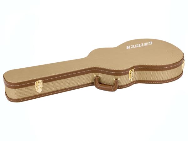 Gretsch Streamlinerの持ち運びに最適なケースです。ツイードの外装に、ゴールドのラッチとハードウェア、ブラウンの豪華な内装、内部の収納スペース、クリーム色のGretschロゴが特徴です。耐久性とスタイルを兼ね備えたケースならどこへでも安心して持ち運べます。