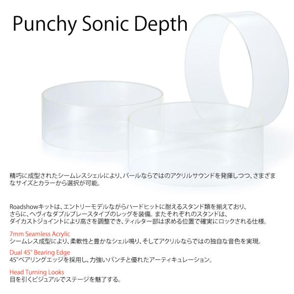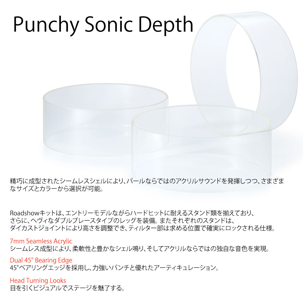 パールのCrystalbeat(w/シームレス・アクリルシェル)は、1973年に誕生し、音抜けの良さとパワー、そして絶大なビジュアル効果を発揮することで傑出したキャラクターを実現している。
