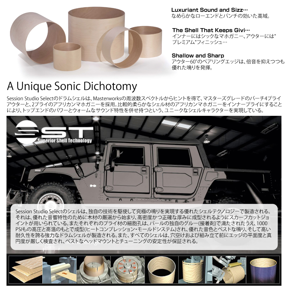 Session Studio Selectのドラムシェルは、Masterworksの周波数スペクトルからヒントを得て、マスターズグレードのバーチ4プライアウターと、2プライのアフリカンマホガニーを採用。比較的柔らかなシェル材のアフリカンマホガニーをインナープライにすることにより、トップエンドのパワーとウォームなサウンド特性を併せ持つという、ユニークなシェルキャラクターを実現している。