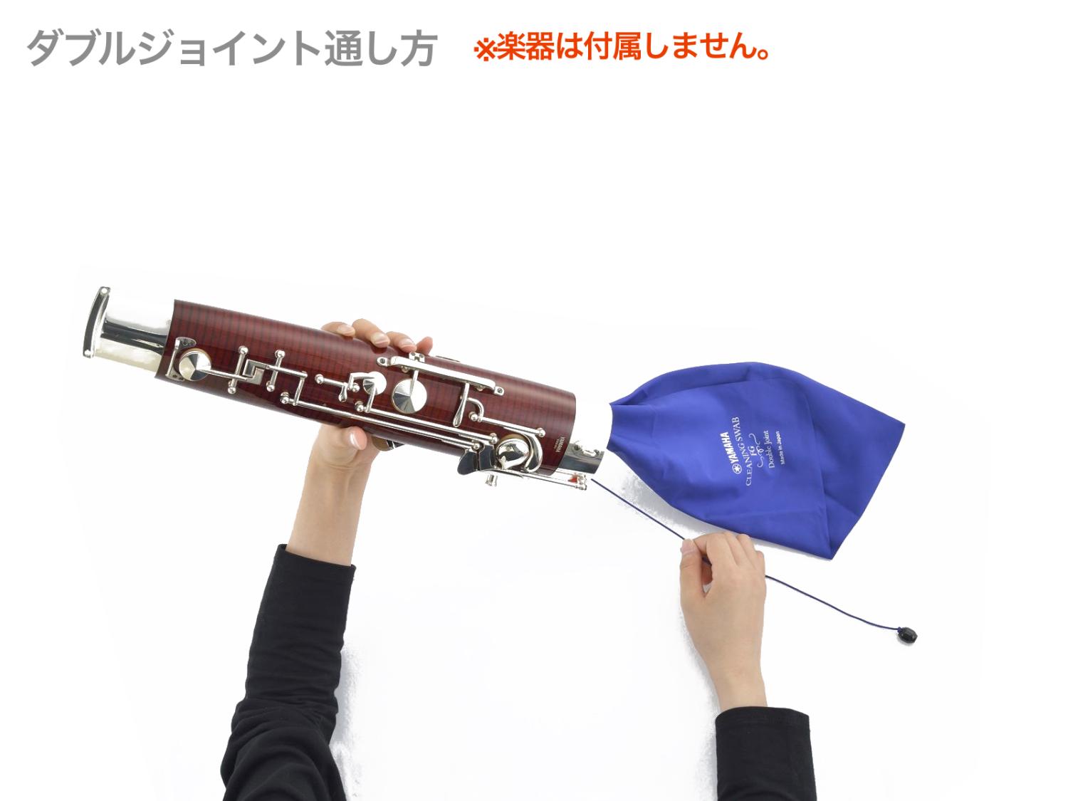 ▼通し方 ■テナージョイントの通し方 2枚あるうちの細い方(おもりが小さい方)がテナージョイント用です。 テナージョイントを通す際はダブルジョイントと接合する方からおもりを入れます。おもりを反対側からだし引き抜きます。ピアニッシモキイ(ウィスパーキイ)に引っかかってしまわないように注意してください。スワブが抜けにくい、またつまらせそうで怖いと思われる場合は逆側から引き抜くことはせず何度か上下に引っ張り水分を除去し、入れた方からスワブを抜いてください。 スワブを上下する際にもピアニッシモキイ(ウィスパーキイ)を曲げてしまわないように注意してくださいね。 ■ダブルジョイントの通し方 2枚あるうちの大きい方(おもりがより大きい方)がダブルジョイント用です。 ダブルジョイント通す際はめんどくさいかもしれませんがU字管(ダブルジョイントのキャップを外したところ)を外してスワブを通すことをおすすめします。 U字管をつけたまま通す際はバスジョイントと接合する部分(太い方から)おもりがついている方を入れて反対側のテナージョイントとの接合部分(細い方)におもりを出し引き抜きます。