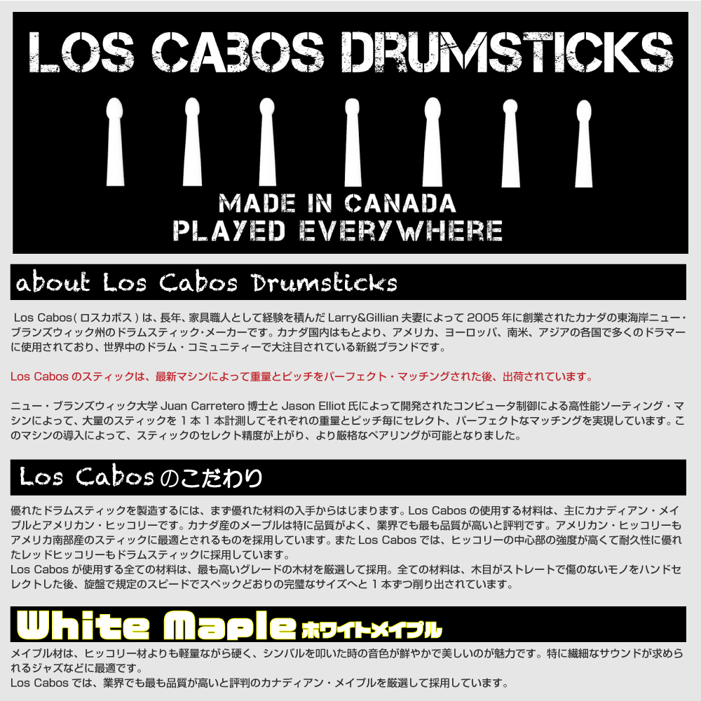 Los Cabos(ロスカボス)は、長年、家具職人として経験を積んだLarry&Gillian夫妻によって2005年に創業されたカナダの東海岸ニュー・ブランズウィック州のドラムスティック・メーカーです。 カナダ国内はもとより、アメリカ、ヨーロッパ、南米、アジアの各国で多くのドラマーに使用されており、 世界中のドラム・コミュニティーで大注目されている新鋭ブランドです。