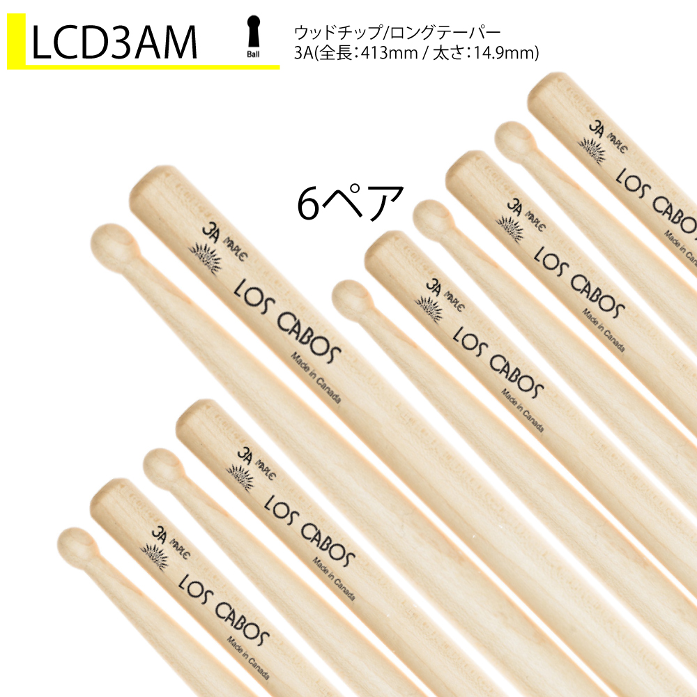 Los Cabos 6ペアセット LCD3AM ホワイトメイプルヒッコリー材よりも軽量ながら硬く、シンバルを叩いた時の音色が鮮やかで美しいのが魅力なメイプルスティック!