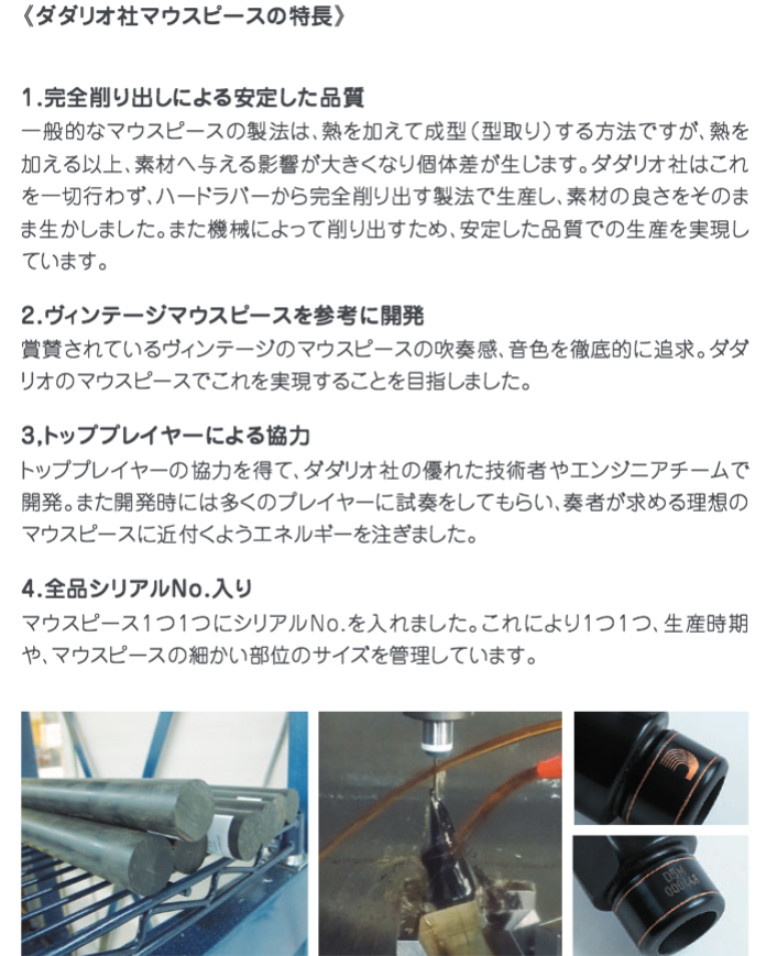 ヴィンテージの音色を持ちながら、気持ちの良い吹奏感を奏者に感じさせる、最適なバランスのとれたマウスピースです。