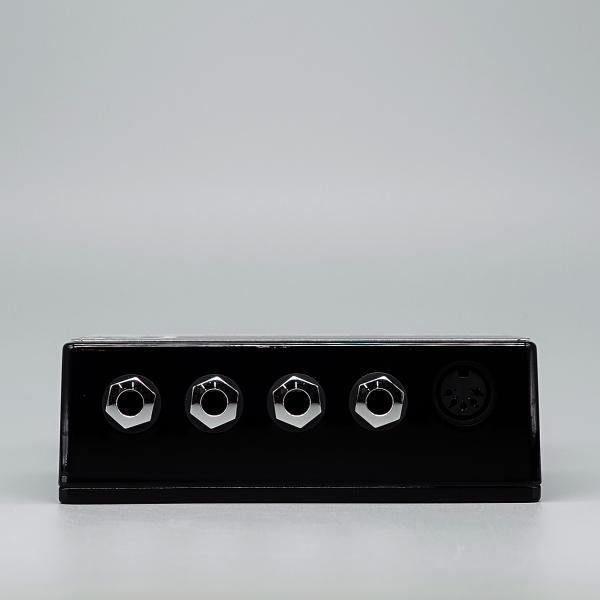 Input端子と3つのThru端子、midi端子を備えており、3つのThruはOutputに割り当て使用するのはもちろんのこと、ステレオプラグを使用したアンプのコントロール信号(ラッチ信号)の接続にも対応。