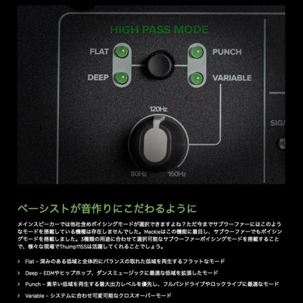 メインスピーカーでは他社含めボイシングモードが選択できますよね。ただ今までサブウーファーにはこのようなモードを搭載している機種は存在しませんでした。Mackieはこの機能に着目し、サブウーファーでもボイシングモードを搭載しました。3種類の用途に合わせて選択可能なサブウーファーボイシングモードを搭載することで、様々な現場でThump115Sは活躍してくれることでしょう。