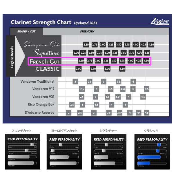 高音域での安定性が増し、より自然な吹奏感が得られます。従来のシグネチャーカットに比べヴァンプ部(リードの削ってある部分)がやや短く幅広なデザインになっています。スイス・イタリアーナ管弦楽団主席クラリネット奏者のコラッド・ジェフレディ氏をはじめ、世界のトッププレイヤー達が愛用中です。