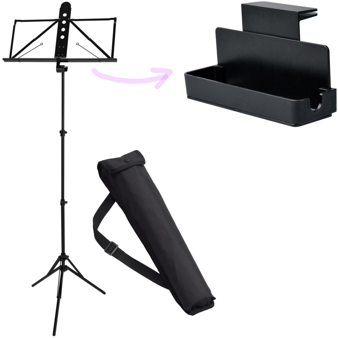 YAMAHA Music stand holder rack ヤマハ 譜面台ラック デラックス MS-RKDX譜面台周りが充実する譜面台ラック 折りたたみ式譜面台のパネル部(譜面をのせる箇所)に取り付けができ、チューナーや電子メトロノーム、筆記用具などが置けます。 譜めくりの際にチューナー等が邪魔にならないよう、ラック位置がパネル取付位置から80mm下になるなど、考えられた仕様になっています。 譜面台はスチールやアルミ製が多いですが、こちらはプラスティック製です。 滑り止めシール入り。 また、こちらのおすすめはMS-RK2との違いでもある「枠(サイドカバー)」の設置。これによって落下を防ぎ安心して物を置くことができます。サイドカバーは取り外しでき、MS-RK2にもご使用いただけます。 右端にはU字溝があり電子メトロノームのイヤホンや、チューナー用マイクのプラグを付けて使用する際も水平に見やすく置くことができます。