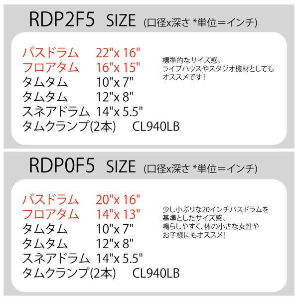 22"バスドラムには16"フロアタムを組み合わせた「 RDP2F5 」、20"バスドラムには14"フロアタムを組み合わせた「 RDP0F5 」セットをご用意しました。スネアを含めた5ピースの本格的なシェル構成は、幅広い音楽ジャンルに対応可能。