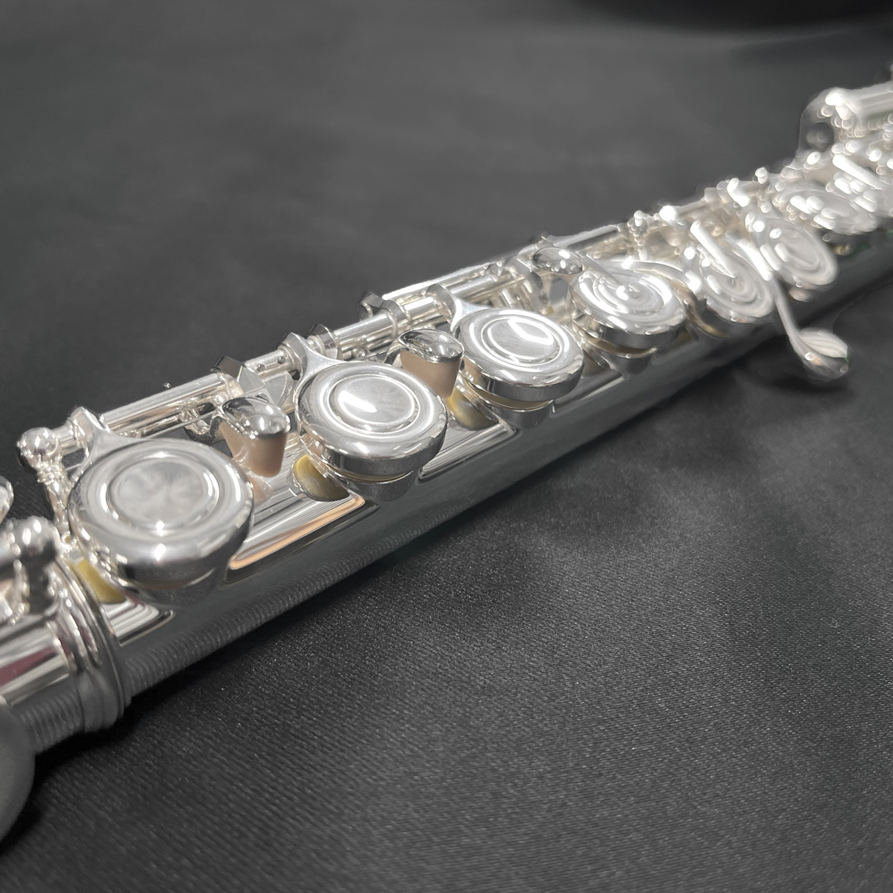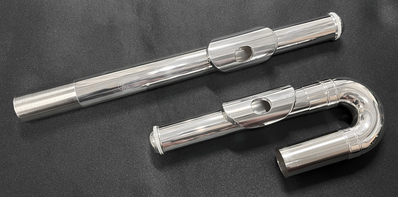 フルートのメカニカルオプション以外の価格の違いは、主に素材であり、それぞれ材質ごとに異なる音の特性を持っています。低価格の一般的な製品は大部分が白銅が用いられており、上位モデルにいくほど口元に近い部分から銀の範囲が広がっていきます。