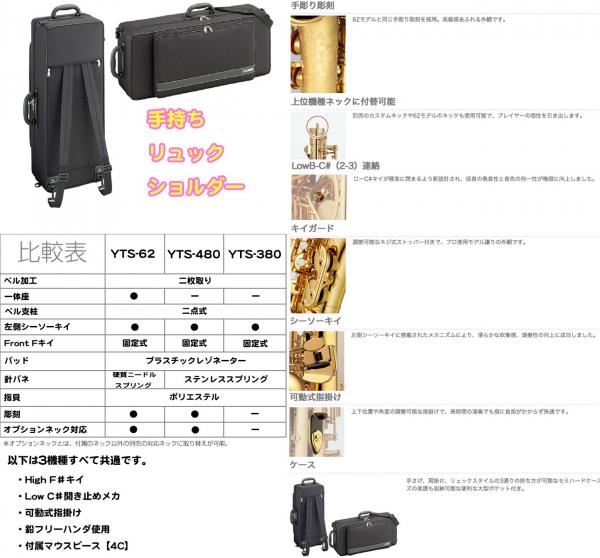 下 位モデルYTS-380との大きな違いであるネック。管楽器は口元に近づくほどよ り音色に差を感じられると言いますので、リード/マウスピース/リガチャー/ネックはこだわる箇所なのです。音の"鳴り"にこだわったこちらのモデル YTS-480は下位モデルYTS-380と異なるネックが付属しております。また、より深く音楽を楽しみ、豊かな音色を生み出したいと思ったとき、高級 モデルであるカスタムシリーズや62モデルのネックにチェンジできるのです。(ネックは単品販売がございます。)380よりは若干価格は上がりますが、初 期投資によって、自分のレベルに合わせ段階を経て長く愛用いただけます。480以上のモデルは基本オプションネック対応となります。