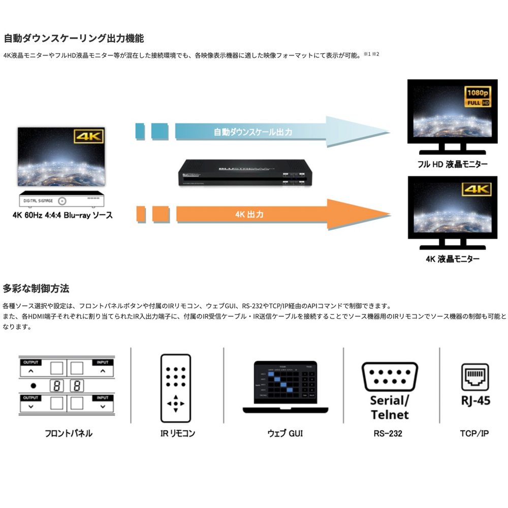 各入出力端子の切替えや設定は、本体フロントパネルに搭載したボタンや付属のIRリモコン、ウェブGUI経由で制御できる他、IR信号、RS-232、TCP/IP経由でのサードパーティーコントロールシステムとの統合が可能です。