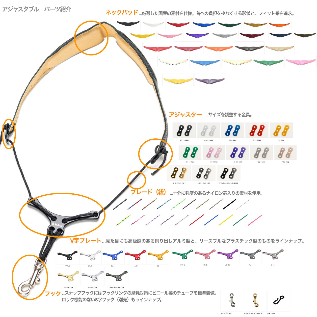 5:フック...スナップフックにはフックリングの摩耗対策にビニール製のチューブを標準装備。ロック機能のないS字フック(別売)もラインナップ。