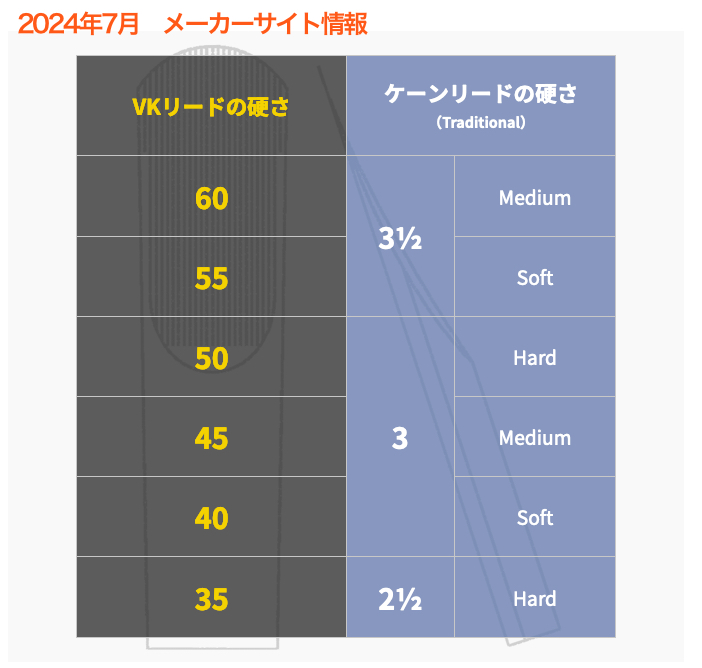 VKリードは6段階ですが、これは通常のケーンリードにおける2-1/2、3、3-1/2の3段階をさらにこまかく分割したものとなります。