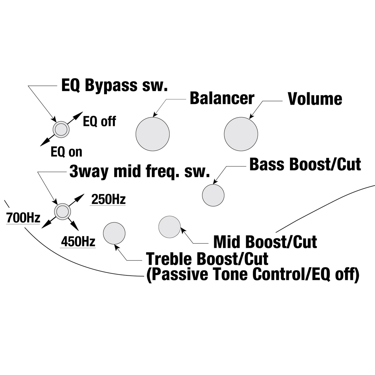 (passive tone control on treble pot), 3-way Mid frequency switch