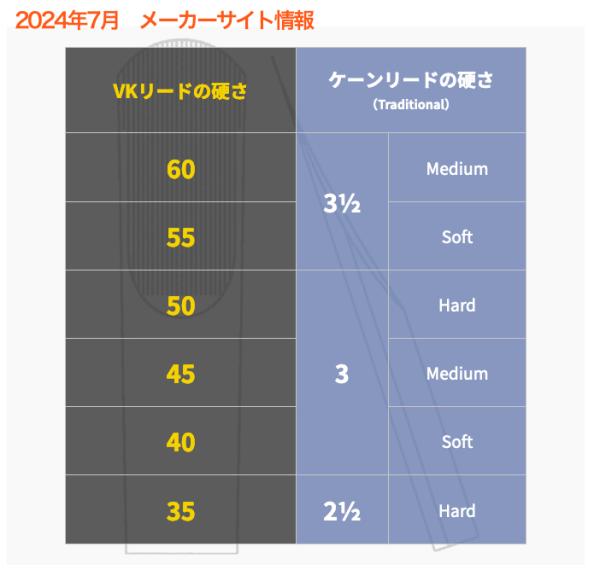 VKリードは6段階ですが、これは通常のケーンリードにおける2-1/2、3、3-1/2の3段階をさらにこまかく分割したものとなります。