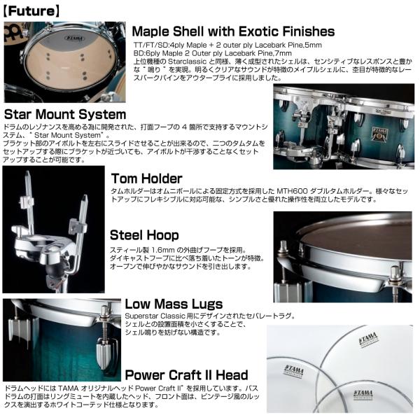 "Superstar Classic" はオールメイプルシェルのドラムセット。"Superstar Classic" はオールメイプルシェルのドラムセット。 薄く成型されたメイプル材のシェルは、どんなチューニングにも繊細に反応し、心地よい音抜けと、明るくクリアーなサウンドを奏でます。 また、フープには外曲げのスティール製フープを採用し、メイプル材の持つオープンで伸びやかなサウンドを更に引き立てます。タムの深さは、少し浅めのサイズを採用し、フィルインでの表情を付けやすく、また、バスドラムの上にマウントした際の高さのセッティングに幅を持たせられるような仕様にしました。